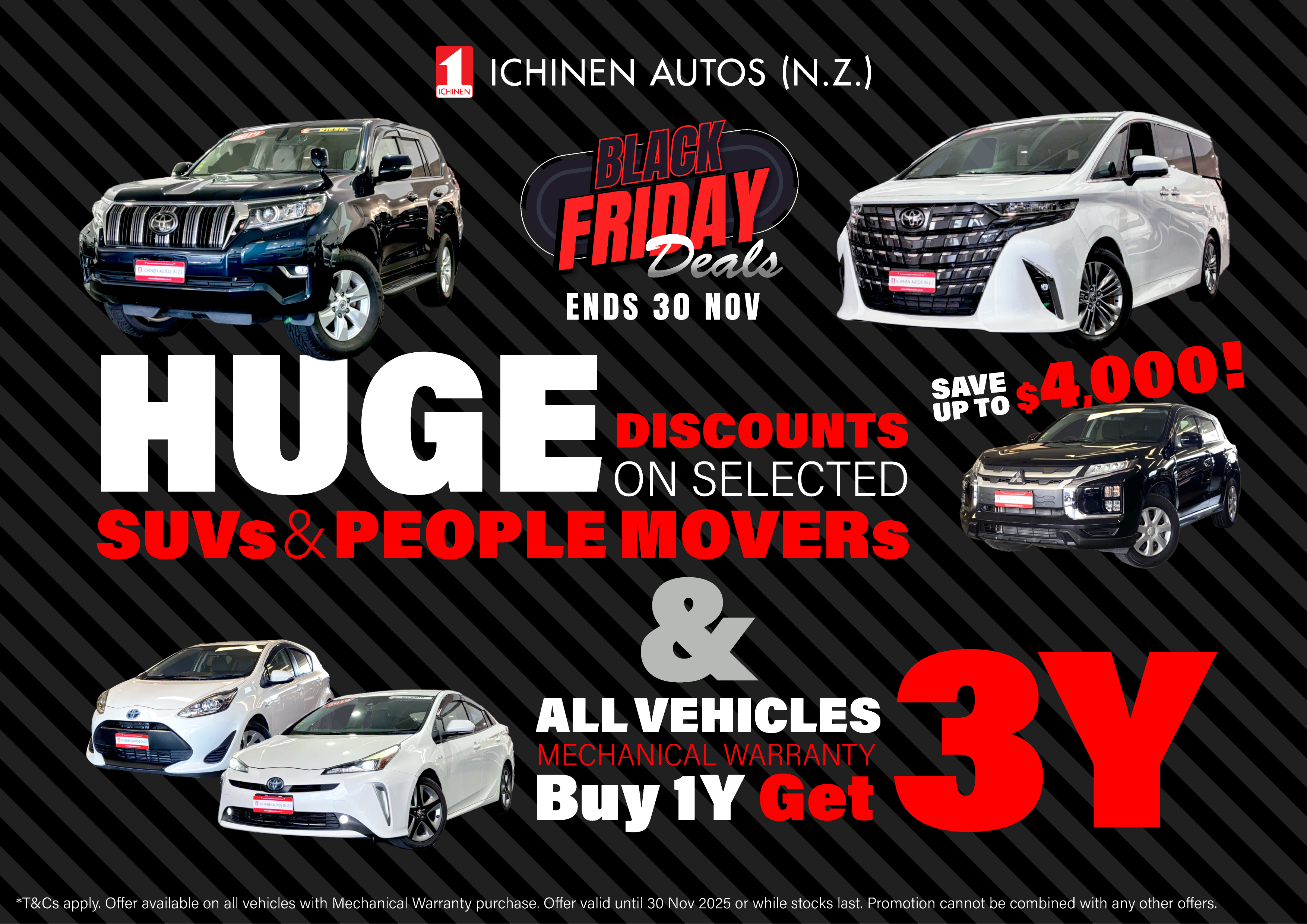 Two Epic Deals This Black Friday 💥 Save up to $4,000 on selected SUVs and People Movers, and get an exclusive 3-Year Mechanical Warranty